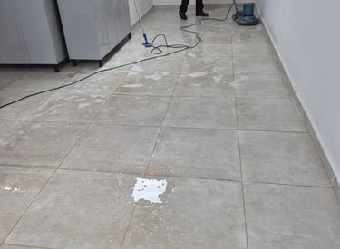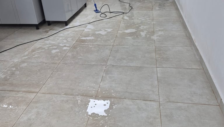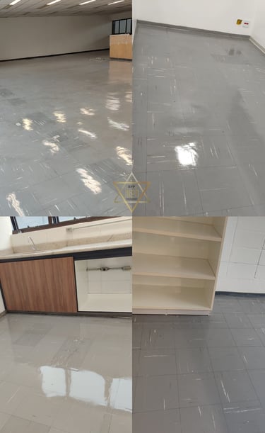 Descarte de resto de materiais e resíduos, remoção de manchas, rejunte, gesso, cola e outros, produtos químicos, limpeza detalhada de azulejos e cerâmicas, aspiração para remoção de poeira fina acumulada e lavagem.