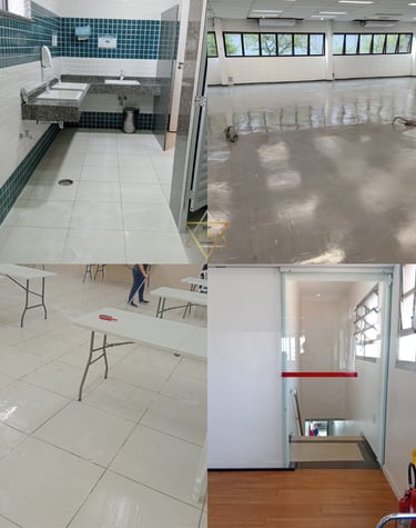 Limpeza geral de espaços, pisos, janelas, vidros, espelhos, aspiração de móveis e objetos. Higienização de banheiros, cozinhas e áreas comuns.